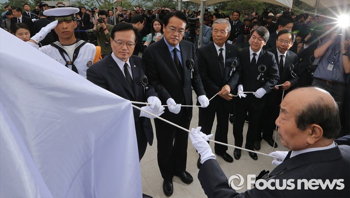 (서울=포커스뉴스)26일 오후 서울 동작구 국립현충원에서 열린 고 김영삼 전 대통령 묘비 제막식에서 정의화 국회의장 및 여야 대표들이 추모비를 제막하고 있다.