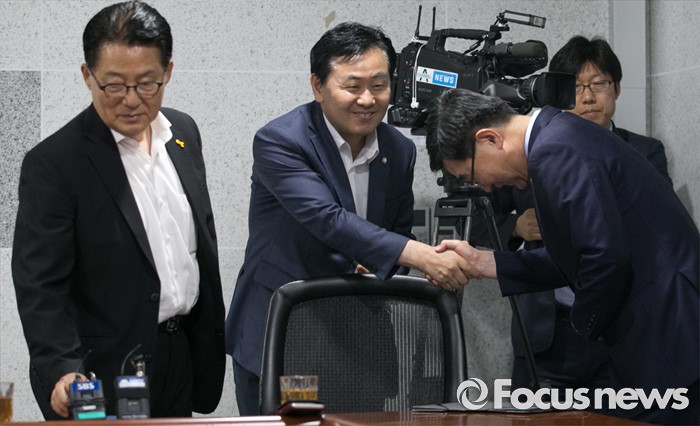 (서울=포커스뉴스) 박지원(왼쪽) 국민의당 원내대표, 김관영(가운데) 원내수석부대표가 26일 오후 서울 여의도 국회 의원회관에서 이기권 고용노동부 장관과 면담에 앞서 인사하고 있다.