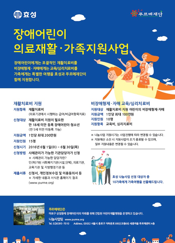 (서울=포커스뉴스) 푸르메재단은 효성과 함께 장애어린이·청소년과 그 가족을 지원하기 위해 '2016 장애어린이·청소년 의료재활·가족지원사업' 신청자를 모집한다고 26일 밝혔다.