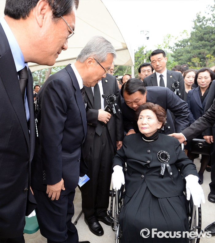 (서울=포커스뉴스) 새누리당 정진석(왼쪽 첫번째) 원내대표와 더불어민주당 김종인 비상대책위원회 대표가 26일 오후 서울 동작구 국립현충원에서 열린 故 김영삼 전 대통령 묘비 제막식에 참석해 손명순 여사에게 인사를 하고 있다.