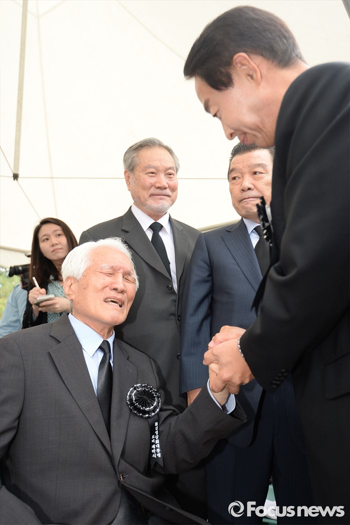 (서울=포커스뉴스)26일 오후 서울 동작구 국립현충원에서 열린 故 김영삼 전 대통령 묘비 제막식에서 김 전 대통령의 차남 김현철씨가 대표가 최형우 전 의원을 위로하고 있다.