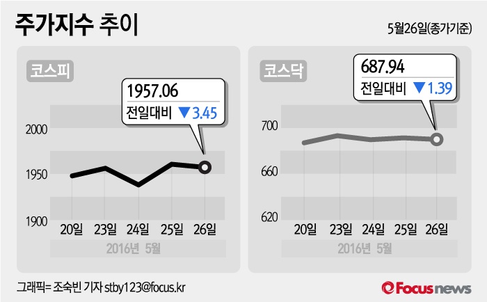 (서울=포커스뉴스) 26일 코스피지수는 전날 보다 0.18%(3.45포인트) 내린 1957.06에 장을 마쳤다. 코스닥지수는 전일 대비 0.20%(1.39포인트) 내린 687.94에 마감했다.