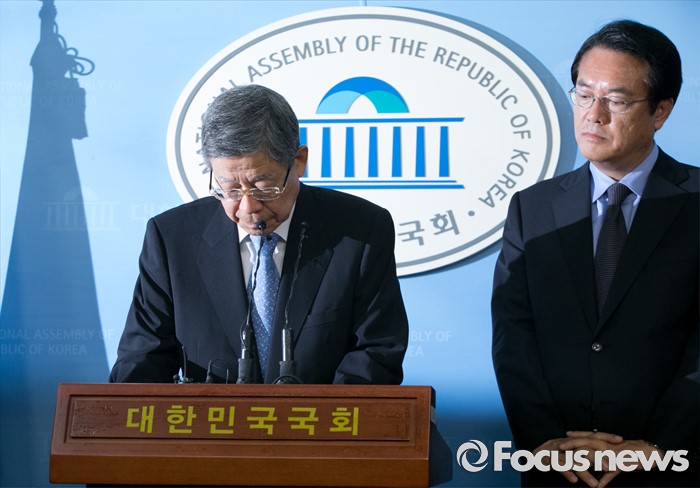(서울=포커스뉴스) 새누리당 혁신비대위원장에 내정된 김희옥(왼쪽) 전 동국대 총장과 정진석 원내대표가 26일 오후 서울 여의도 국회 정론관에서 기자회견을 하고 있다.