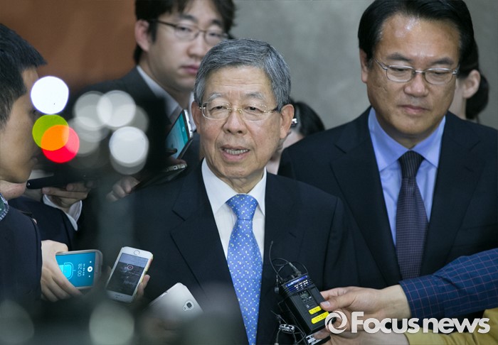 (서울=포커스뉴스) 새누리당 혁신비대위원장에 내정된 김희옥(왼쪽) 전 동국대 총장과 정진석 원내대표가 26일 오후 서울 여의도 국회 정론관에서 기자회견을 마친 뒤 취재진 질문에 답하고 있다.