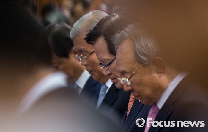 (서울=포커스뉴스) 26일 오후 서울 여의도 국회 헌정기념관에서 열린 '새한국의 비전' 창립 기념식에서 천정배 국민의당 공동대표, 김종인 더불어민주당 비상대책위 대표, 정의화 국회의장, 박관용 전 국회의장 및 참석자들이 묵념하고 있다.