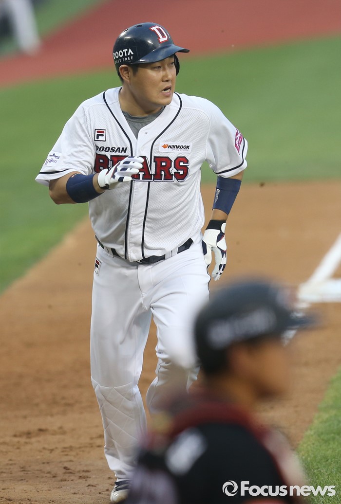 (서울=포커스뉴스) 26일 서울 잠실구장에서 열린 2016프로야구 kt-두산 경기 2회말 1사 만루에서 두산 3루주자 양의지가 김재호의 우익수 희생플라이때 홈인하고 있다.