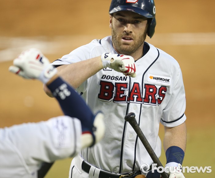 (서울=포커스뉴스) 26일 서울 잠실구장에서 열린 2016프로야구 kt-두산 경기 3회말 1사후 두산 에반스가 좌월 솔로 홈런을 치고 김재환의 환영을 받으며 홈인하고 있다.