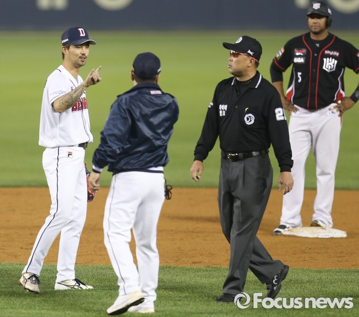 | △ 항의하는 두산 김태형 감독 |
