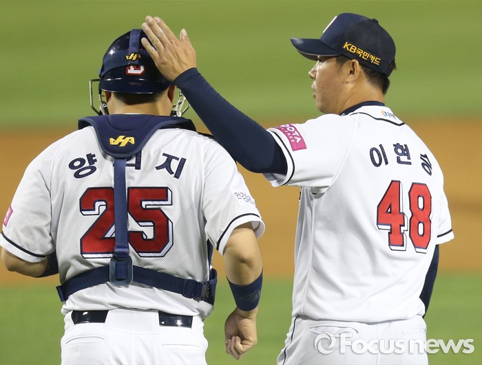 (서울=포커스뉴스) 26일 서울 잠실구장에서 열린 2016프로야구 kt-두산 경기에서 세이브를 따낸 두산 이현승이 포수 양의지의 머리를 쓰다듬고 있다.