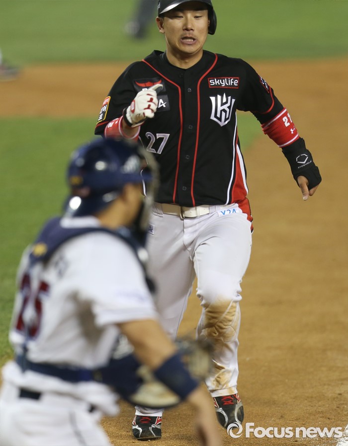 (서울=포커스뉴스) 26일 서울 잠실구장에서 열린 2016프로야구 kt-두산 경기 7회초 중전 안타로 진루한 kt 1루주자 오정복이 마르테의 좌중간 2루타때 홈까지 뛰어 세이프되고 있다.