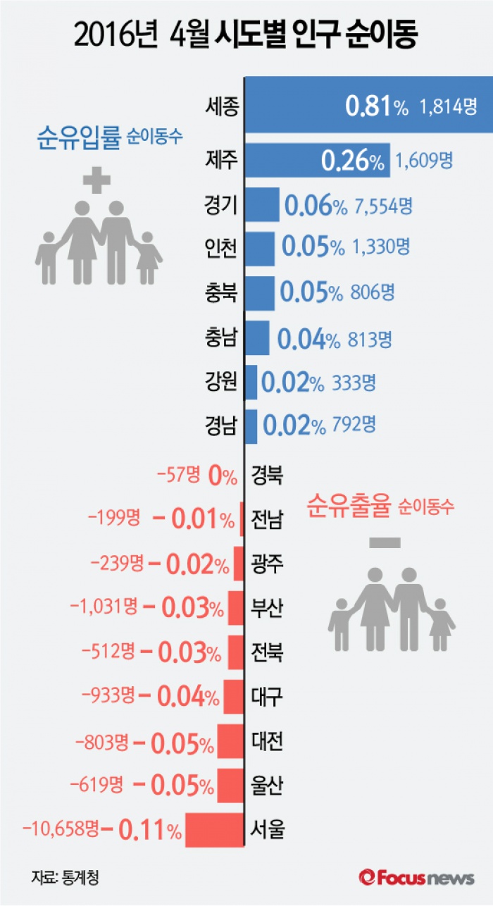 (서울=포커스뉴스) 26일 통계청은 2016년 4월 시도별 순이동(전입-전출)은 경기(7,554명), 세종(1,814명), 제주(1,609명) 등 8개 시도는 순유입, 서울(-10,658명), 부산(-1,031명), 대구(-933명) 등 9개 시도는 순유출되었다고 발표했다.
