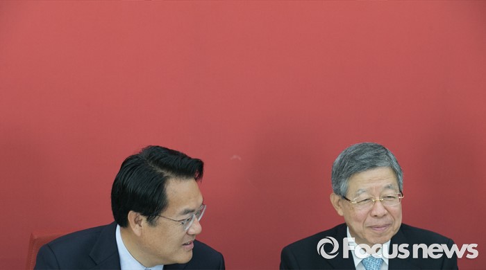 (서울=포커스뉴스) 정진석(왼쪽) 새누리당 원내대표와 김희옥 혁신비대위원장 내정자가 27일 오전 서울 여의도 국회에서 원내지도부와 상견례 자리에 참석해 대화하고 있다.