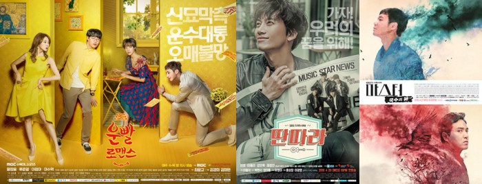 '딴따라', '마스터-국수의 신'은 각 12회, 10회까지 방영하며 극 후반으로 치닫고 있는 상황이다. 새 출발한 '운빨로맨스'가 앞으로 시청률 경쟁을 이끌 수 있을지 시청자들의 관심이 쏠리고 있다.지상파 수목드라마가 치열한 시청률 경쟁을 벌였다. 왼쪽부터 '운빨로맨스', '딴따라', '마스터-국수의 신' 포스터. <사진제공=MBC, SBS, KBS>