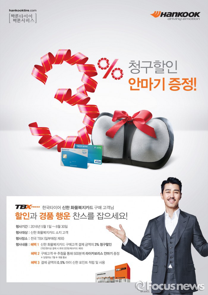 (서울=포커스뉴스) 한국타이어는 30일까지 트럭버스용 타이어를 구매하는 고객에게 할인 혜택과 경품을 제공하는 '신한 화물복지카드 제휴 이벤트'를 진행한다.