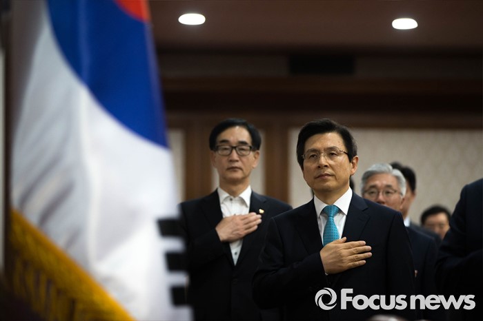(서울=포커스뉴스) 27일 오전 서울 종로구 정부서울청사에서 열린 임시 국무회의에서 황교안 국무총리가 국기에 대한 경례를 하고 있다.