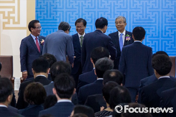 (서울=포커스뉴스) 정의화 국회의장과 김종인 더불어민주당 비상대책위 대표가 27일 오전 서울 여의도 국회에서 열린 '제68주년 국회 개원 기념식'에 참석해 악수하고 있다. 이날 정진석 새누리당 원내대표는 행사에 참석하지 않았다.