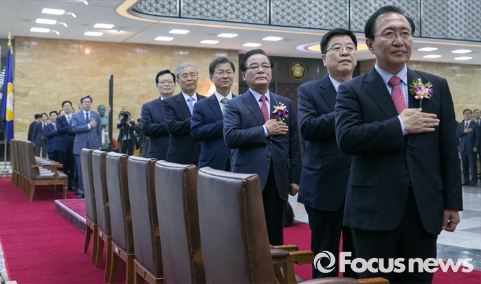 (서울=포커스뉴스) 27일 오전 서울 여의도 국회에서 열린 68주년 국회 개원 기념식에 참석한 노회찬(오른쪽부터) 정의당 원내대표, 김광림 새누리당 정책위의장, 정갑윤 국회 부의장, 천정배 국민의당 공동대표, 김종인 더불어민주당 비대위 대표, 정의화 국회의장 등 참석자들이 국기에 대한 경례를 하고 있다.