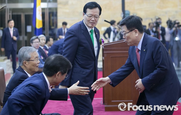 | △ 국회 개원 기념식, 인사하는 여야 |