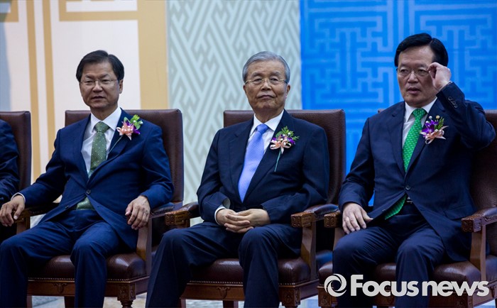 (서울=포커스뉴스) 정의화(오른쪽) 국회의장과 김종인(가운데) 더불어민주당 비상대책위 대표, 천정배 국민의당 공동대표가 27일 오전 서울 여의도 국회에서 열린 '제68주년 국회 개원 기념식'에 참석하고 있다. 이날 정 의장은 헌법-국회관계법 책을 손에 들고 국회법 개정안에 대해 대통령의 거부권 행사에 대한 입장을 밝혔다.