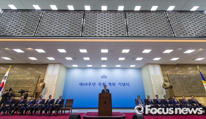 (서울=포커스뉴스) 정의화 국회의장이 27일 오전 서울 여의도 국회에서 열린 '제68주년 국회 개원 기념식'에 참석해 인사말을 하고 있다. 이날 정 의장은 헌법-국회관계법 책을 손에 들고 국회법 개정안에 대해 대통령의 거부권 행사에 대한 입장을 밝혔다.