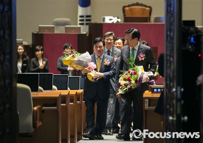 (서울=포커스뉴스) 27일 오전 서울 여의도 국회에서 68주년 국회 개원 기념식을 마친 정의화(오른쪽) 국회의장이 본회의장에서 이석현 국회 부의장 등 직원들과 함께 기념촬영 후 나서고 있다.