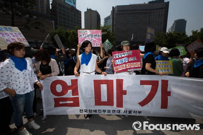(서울=포커스뉴스)27일 오전 서울 중구 서울시청 앞에서 전국 장애인 부모연대와 서울특수학교학부모협의회 회원들이 발달장애인 정책 수립을 촉구하는 삭발식이 열리고 있다.