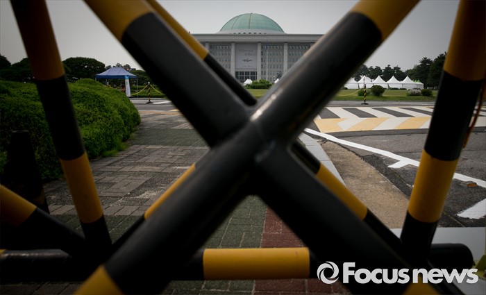 (서울=포커스뉴스) 정부가 상시 청문회 등의 내용이 포함된 국회법 개정안에 대해 거부권을 행사해 여야가 입장 차이를 보이고 있는 27일 오후 서울 여의도 국회 정문 바리케이트 너머로 본청이 보이고 있다.