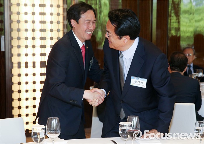(서울=포커스뉴스) 27일 오후 서울 웨스틴 조선호텔에서 열린 2016 한반도통일 심포지엄 기념 오찬에 참석한 정진석(오른쪽) 새누리당 원내대표와 우상호 더불어민주당 원내대표가 악수하고 있다.