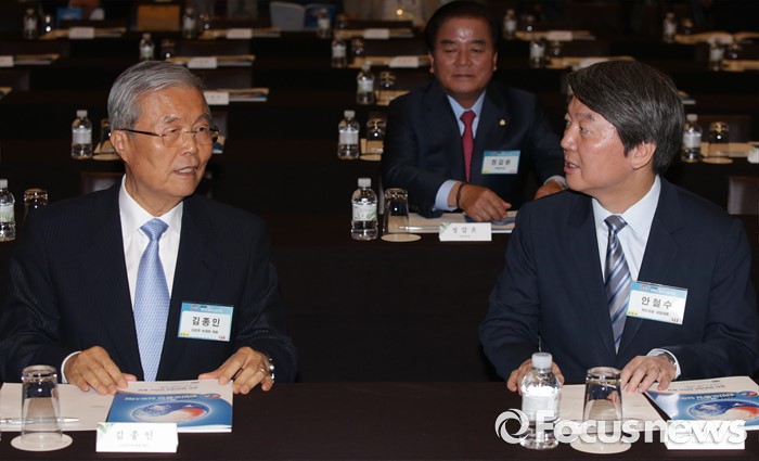 (서울=포커스뉴스) 27일 오후 서울 웨스틴 조선호텔에서 열린 2016 한반도통일 심포지엄에 참석한 김종인(왼쪽) 더불어민주당 비대위 대표와 안철수 국민의당 상임공동대표가 대화하고 있다.
