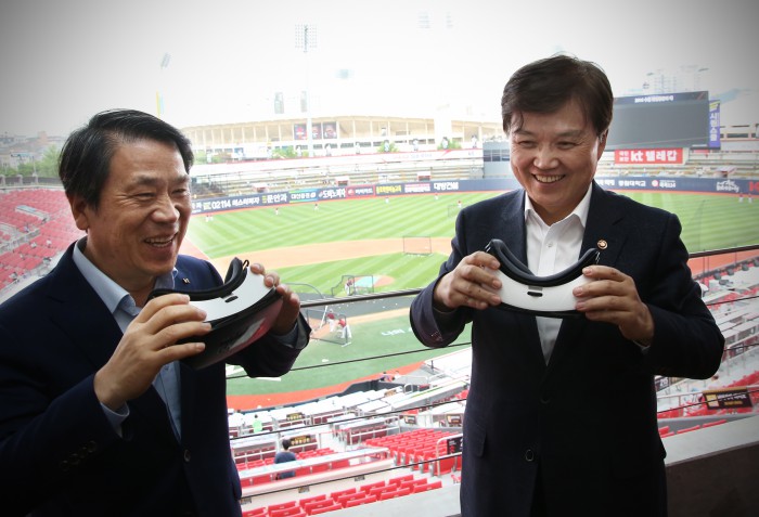 최 장관은 "야구와 같은 역동적인 스포츠에 첨단 ICT 기술을 접목하니 스포츠를 관람하는 재미가 배가되고 실감나게 즐길 수 있는 시간이 됐다. 앞으로 더 많은 사람들이 한층 더 발전된 스포츠-ICT 융합 서비스를 누릴 수 있도록 노력과 지원을 아끼지 않겠다"고 밝혔다.미래창조과학부 최양희 장관(오른쪽)이 27일 프로야구 kt 홈구장인 수원 케이티 위즈파크를 찾아 kt스포츠 김준교 사장과 함께 프로야구 실시간 가상현실(VR) 중계 체험 뒤 이야기를 나누고 있다. <사진제공=kt 위즈>