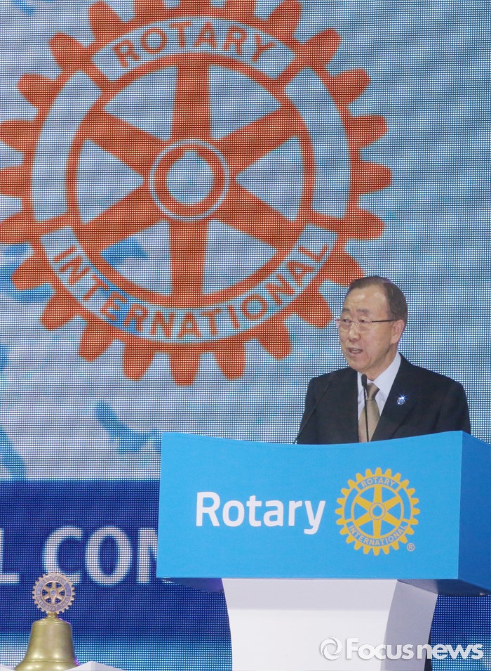(서울=포커스뉴스) 반기문 유엔 사무총장이 29일 오전 경기 고양시 킨텍스 제1전시장에서 열린 2016 국제로타리 세계대회에 참석해 기조연설 하고 있다.