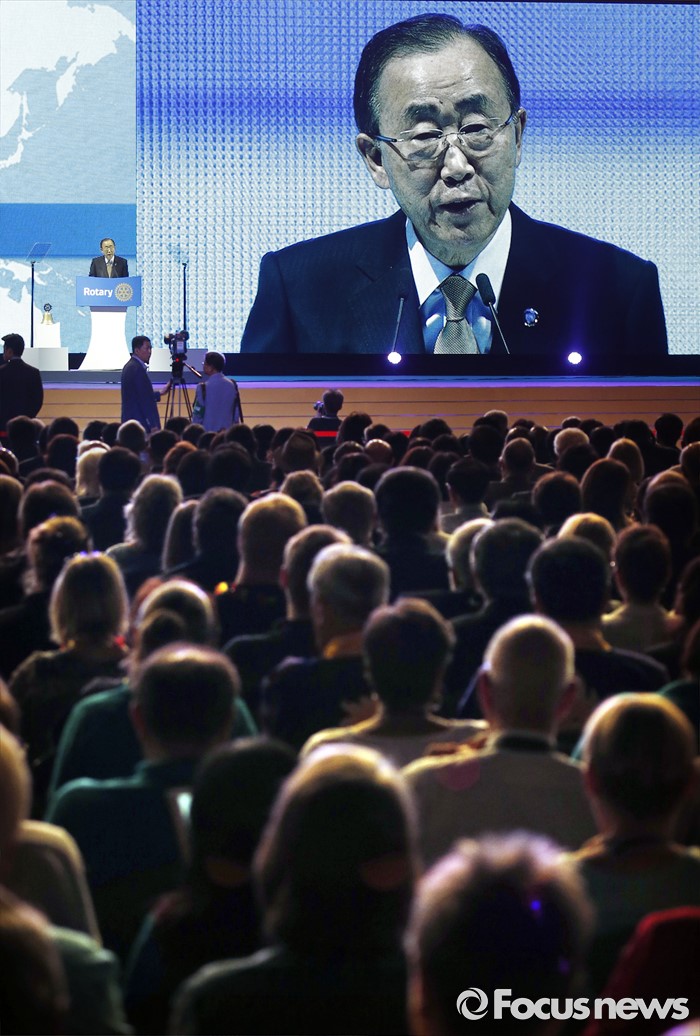 (서울=포커스뉴스) 반기문 유엔 사무총장이 29일 오전 경기 고양시 킨텍스 제1전시장에서 열린 2016 국제로타리 세계대회에 참석해 기조연설 하고 있다.