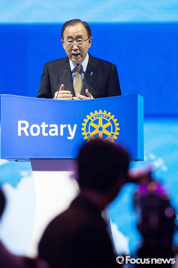 (서울=포커스뉴스) 반기문 유엔 사무총장이 29일 오전 경기 고양시 킨텍스 제1전시장에서 열린 2016 국제로타리 세계대회에 참석해 기조연설 하고 있다.