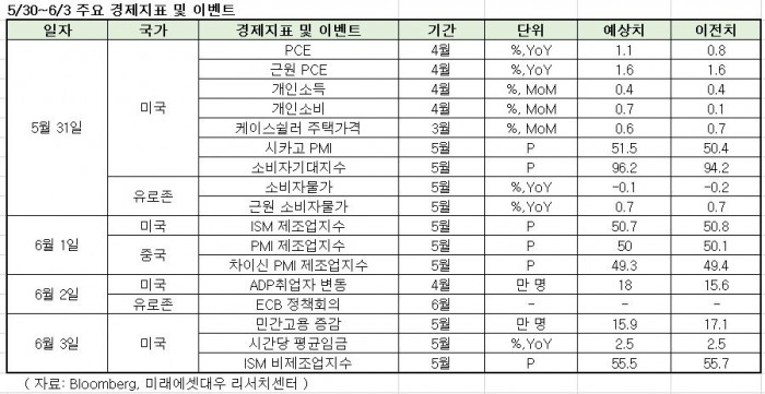 이번주 주목할 이벤트와 경제지표는 △중국 5월 제조업 구매관리자지수(PMI) △유럽중앙은행(ECB) 정책회의 △미국 5월 고용보고서 발표 등이 있다.