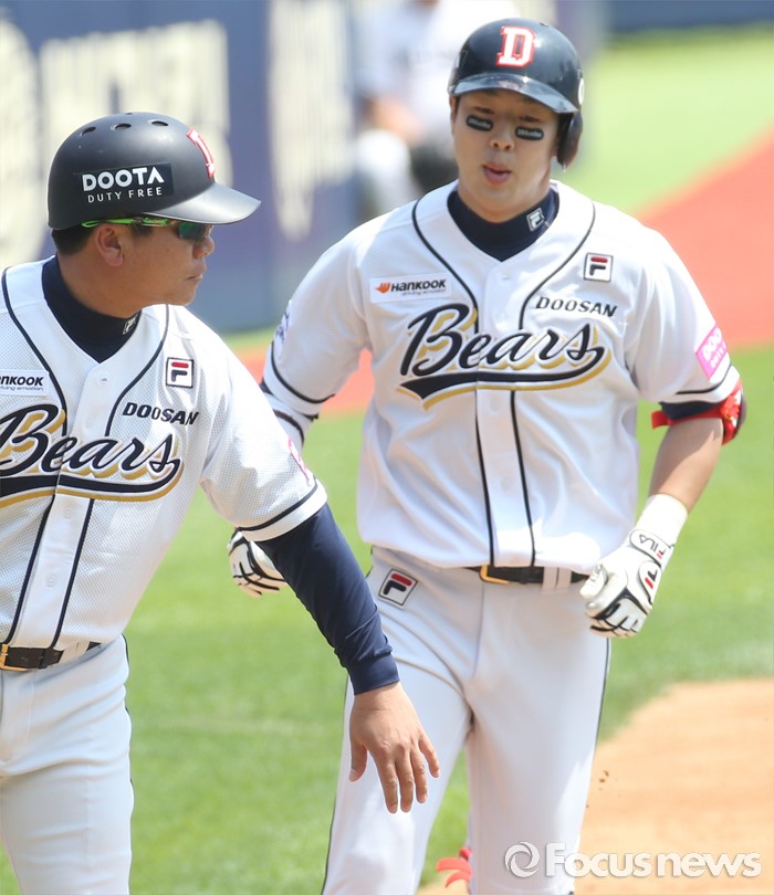 (서울=포커스뉴스) 29일 서울 잠실구장에서 열린 2016프로야구 LG-두산 경기 1회말 두산 선두타자 박건우가 좌월 솔로 홈런을 치고 3루를 돌며 전형도 코치의 환영을 받고 있다.