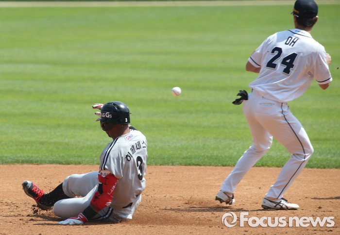 (서울=포커스뉴스) 29일 서울 잠실구장에서 열린 2016프로야구 LG-두산 경기에 2회초 LG 선두타자 히메네스가 좌잇수 뒤로 떨어지는 2루타를 치고 2루에서 슬라이딩하며 세이프되고 있다.