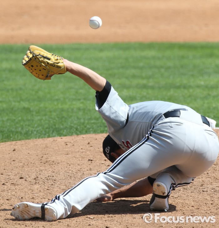 (서울=포커스뉴스) 29일 서울 잠실구장에서 열린 2016프로야구 LG-두산 경기에서 LG 투수 최동환이 동시에 날아온 볼 두개를 피하다 마운드에서 넘어지고 있다.