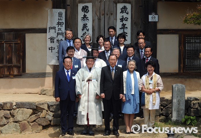 (안동=포커스뉴스) 반기문 유엔 사무총장이 29일 오후 유네스코 세계문화유산으로 등재된 경북 안동 하회마을을 방문해 충효당 앞에서 기념 촬영을 하고 있다.