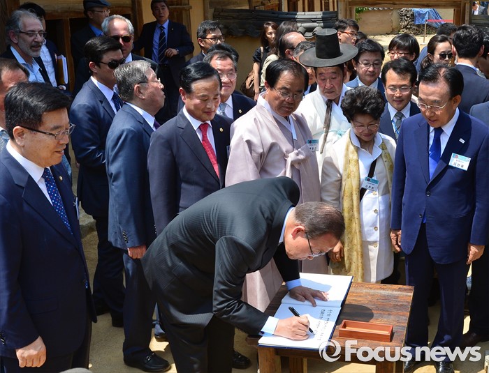 (안동=포커스뉴스) 반기문 유엔 사무총장이 29일 오후 경북 안동 하회마을의 서애 류성룡 고택을 방문, 김관용(오른쪽) 경북도지사와 김광림(왼쪽) 새누리당 정책위의장, 류왕근 하회마을 보존회 이사장 등 관계자들이 지켜보는 가운데 방명록을 쓰고 있다.