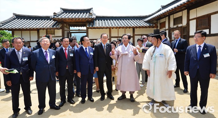 (안동=포커스뉴스) 반기문 유엔 사무총장이 29일 오후 유네스코 세계문화유산으로 지정된 경북 안동 하회마을을 방문, 김관용 경북도지사, 류왕근 하회마을 보존회 이사장, 김광림 새누리당 정책위의장, 권영세 안동시장, 류상붕 풍산류씨 양진당 대종손 등 내빈들과 함께 풍산 류씨 종택인 양진당을 둘러보고 있다.