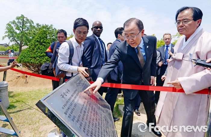 (안동=포커스뉴스) 반기문 유엔 사무총장이 29일 경북 안동 하회마을 충효당 인근에서 기념식수를 마치고 1999년 엘리자베스 2세 영국 여왕이 방문 당시 심었던 구상나무를 둘러보고 있다.