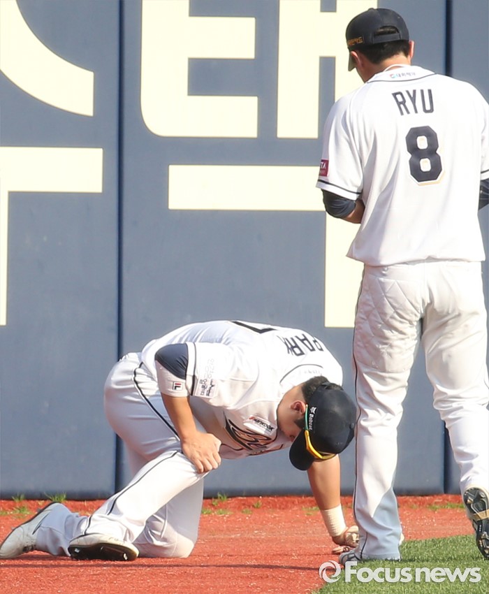 (서울=포커스뉴스) 29일 서울 잠실구장에서 열린 2016프로야구 LG-두산 경기 7회초 무사 1,2루에서 LG 유강남의 파울 타구를 잡으려다 펜스에 부딪친 두산 좌익수 박건우가 오른쪽 무릎을 잡고 고통스러워하고 있다.