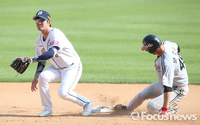 (서울=포커스뉴스) 29일 서울 잠실구장에서 열린 2016프로야구 LG-두산 경기 6회초 2사후 번트 안타로 진루한 LG 문선재가 2루 도루에 성공하고 있다.