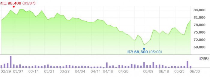 30일 오전 9시14분 현재 SK케미칼 주가는 전거래일 보다 2.3% 오른 7만9900원에 거래되고 있다.