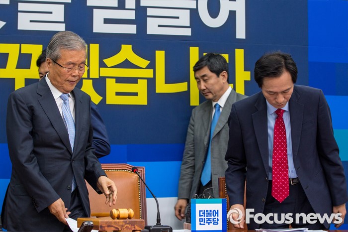 (서울=포커스뉴스) 김종인(왼쪽) 더불어민주당 비상대책위 대표와 우상호(오른쪽) 원내대표를 비롯한 비대위원들이 30일 오전 서울 여의도 국회에서 열린 비상대책위원회의에 참석하기 위해 회의실로 들어서고 있다.
