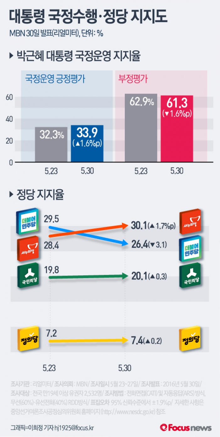 (서울=포커스뉴스) MBN이 의뢰, 리얼미터가 조사해 30일 발표한 여론조사 결과에 따르면 박근혜 대통령의 지지도(긍정평가)는 지난주에 비해 1.6%p 오른 33.9%를 기록했다. 반면 '국정수행을 잘못하고 있다'는 부정평가는 61.3%로 지난주 대비 1.6%p 하락한 것으로 나타났다.