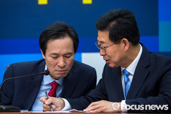 (서울=포커스뉴스) 우상호(왼쪽) 더불어민주당 원내대표와 양승조 비상대책위원이 30일 오전 서울 여의도 국회에서 열린 비상대책위원회의에 참석해 대화 나누고 있다.