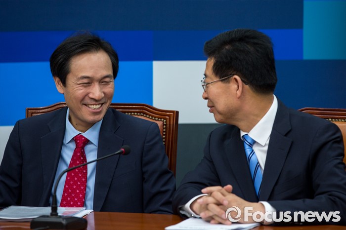 (서울=포커스뉴스) 우상호(왼쪽) 더불어민주당 원내대표와 양승조 비상대책위원이 30일 오전 서울 여의도 국회에서 열린 비상대책위원회의에 참석해 대화 나누고 있다.