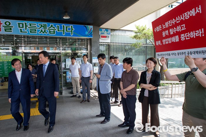 (서울=포커스뉴스) 30일 오전 서울 동작구청에서 박원순 서울시장이 노량진수산시장 상인생계대책위원회 관계자들의 손팻말 앞을 지나가고 있다.