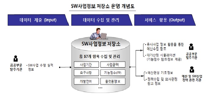 서석진 미래부 국장은 “SW사업정보 활용 서비스가 공공부문 SW사업의 정당한 사업대가 지급 및 적정 사업기간 보장에 기여할 것으로 기대한다”라며 “향후 기획재정부와 협조해, 공공 SW사업의 예산 요구 시 SW사업정보 저장소를 통한 사업규모 산출결과의 제출 의무화를 추진하여 SW사업정보 활용 서비스가 활성화 되도록 노력하겠다”고 밝혔다.공공 SW사업정보 활용 서비스 운영 개념도.<그림제공=미래부>